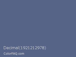 Decimal 1921212978 Color is a normal blue color and the nearest color is UCLA Blue #536895. Hex code #576488 and RGB value is rgb(87,100,136). In RGB color space, this color is composed of 34% red, 39% green, 53% blue, In CMYK color space, this color is composed of 36% cyan, 26% magenta, 0% yellow , 47% black , In HSL color space, this color has a hue angle of 224° , 22% saturation and 44% lightness.