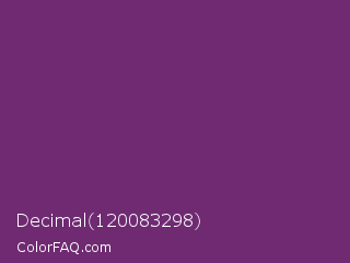 Decimal 120083298 Color is a normal magenta color and the nearest color is Midnight #702670. Hex code #6f2a72 and RGB value is rgb(111,42,114). In RGB color space, this color is composed of 44% red, 16% green, 45% blue, In CMYK color space, this color is composed of 3% cyan, 63% magenta, 0% yellow , 55% black , In HSL color space, this color has a hue angle of 298° , 46% saturation and 31% lightness.
