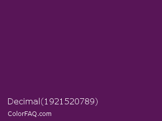 Decimal 1921520789 Color is a very dark magenta color and the nearest color is Clairvoyant #480656. Hex code #581557 and RGB value is rgb(88,21,87). In RGB color space, this color is composed of 35% red, 8% green, 34% blue, In CMYK color space, this color is composed of 0% cyan, 76% magenta, 1% yellow , 65% black , In HSL color space, this color has a hue angle of 301° , 61% saturation and 21% lightness.