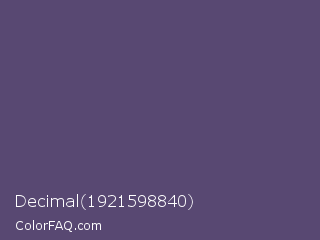 Decimal 1921598840 Color is a normal violet color and the nearest color is Cyber Grape #58427c. Hex code #584872 and RGB value is rgb(88,72,114). In RGB color space, this color is composed of 35% red, 28% green, 45% blue, In CMYK color space, this color is composed of 23% cyan, 37% magenta, 0% yellow , 55% black , In HSL color space, this color has a hue angle of 263° , 23% saturation and 36% lightness.