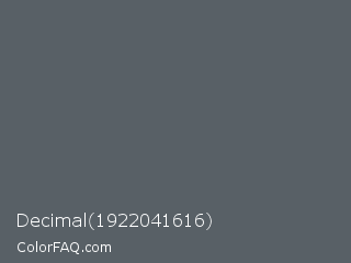 Decimal 1922041616 Color is a normal blue color and the nearest color is Black Coral #54626f. Hex code #586066 and RGB value is rgb(88,96,102). In RGB color space, this color is composed of 35% red, 38% green, 40% blue, In CMYK color space, this color is composed of 14% cyan, 6% magenta, 0% yellow , 60% black , In HSL color space, this color has a hue angle of 206° , 7% saturation and 37% lightness.