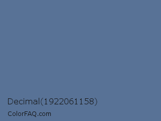 Decimal 1922061158 Color is a normal blue color and the nearest color is Waikawa Gray #5a6e9c. Hex code #587296 and RGB value is rgb(88,114,150). In RGB color space, this color is composed of 35% red, 45% green, 59% blue, In CMYK color space, this color is composed of 41% cyan, 24% magenta, 0% yellow , 41% black , In HSL color space, this color has a hue angle of 215° , 26% saturation and 47% lightness.