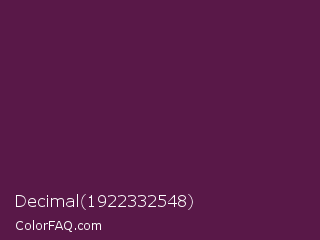 Decimal 1922332548 Color is a very dark magenta color and the nearest color is Wine Berry #591d35. Hex code #591848 and RGB value is rgb(89,24,72). In RGB color space, this color is composed of 35% red, 9% green, 28% blue, In CMYK color space, this color is composed of 0% cyan, 73% magenta, 19% yellow , 65% black , In HSL color space, this color has a hue angle of 316° , 58% saturation and 22% lightness.