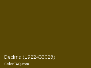 Decimal 1922433028 Color is a very dark yellow color and the nearest color is Bronze Olive #4e420c. Hex code #594804 and RGB value is rgb(89,72,4). In RGB color space, this color is composed of 35% red, 28% green, 2% blue, In CMYK color space, this color is composed of 0% cyan, 19% magenta, 96% yellow , 65% black , In HSL color space, this color has a hue angle of 48° , 91% saturation and 18% lightness.
