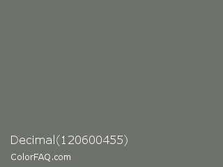 Decimal 120600455 Color is a normal green color and the nearest color is Dove Gray #6d6c6c. Hex code #6f726b and RGB value is rgb(111,114,107). In RGB color space, this color is composed of 44% red, 45% green, 42% blue, In CMYK color space, this color is composed of 3% cyan, 0% magenta, 6% yellow , 55% black , In HSL color space, this color has a hue angle of 86° , 3% saturation and 43% lightness.