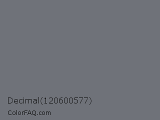 Decimal 120600577 Color is a normal blue color and the nearest color is Sonic Silver #757575. Hex code #6f7279 and RGB value is rgb(111,114,121). In RGB color space, this color is composed of 44% red, 45% green, 47% blue, In CMYK color space, this color is composed of 8% cyan, 6% magenta, 0% yellow , 53% black , In HSL color space, this color has a hue angle of 222° , 4% saturation and 45% lightness.