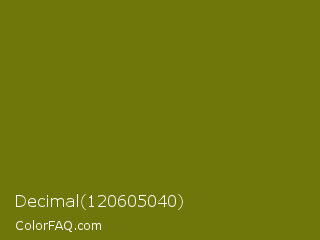 Decimal 120605040 Color is a dark yellow color and the nearest color is Olivetone #716e10. Hex code #6f770a and RGB value is rgb(111,119,10). In RGB color space, this color is composed of 44% red, 47% green, 4% blue, In CMYK color space, this color is composed of 7% cyan, 0% magenta, 92% yellow , 53% black , In HSL color space, this color has a hue angle of 64° , 84% saturation and 25% lightness.