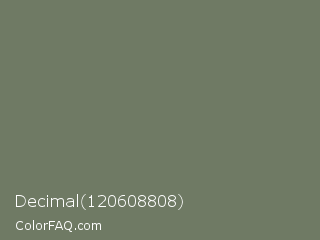 Decimal 120608808 Color is a normal green color and the nearest color is Limed Ash #747d63. Hex code #6f7a64 and RGB value is rgb(111,122,100). In RGB color space, this color is composed of 44% red, 48% green, 39% blue, In CMYK color space, this color is composed of 9% cyan, 0% magenta, 18% yellow , 52% black , In HSL color space, this color has a hue angle of 90° , 10% saturation and 44% lightness.