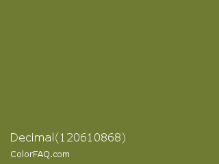 Decimal 120610868 Color is a normal yellow color and the nearest color is Crete #737829. Hex code #6f7b32 and RGB value is rgb(111,123,50). In RGB color space, this color is composed of 44% red, 48% green, 20% blue, In CMYK color space, this color is composed of 10% cyan, 0% magenta, 59% yellow , 52% black , In HSL color space, this color has a hue angle of 70° , 42% saturation and 34% lightness.