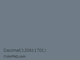 Decimal 120611701 Color is a normal blue color and the nearest color is Raven #727b89. Hex code #6f7c87 and RGB value is rgb(111,124,135). In RGB color space, this color is composed of 44% red, 49% green, 53% blue, In CMYK color space, this color is composed of 18% cyan, 8% magenta, 0% yellow , 47% black , In HSL color space, this color has a hue angle of 208° , 10% saturation and 48% lightness.