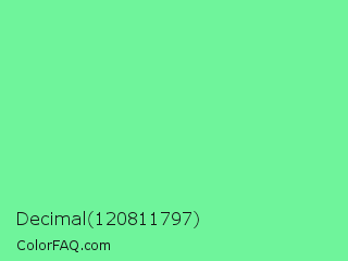 Decimal 120811797 Color is a light green color and the nearest color is Very Light Malachite Green #64e986. Hex code #6ff49b and RGB value is rgb(111,244,155). In RGB color space, this color is composed of 44% red, 96% green, 61% blue, In CMYK color space, this color is composed of 55% cyan, 0% magenta, 36% yellow , 4% black , In HSL color space, this color has a hue angle of 140° , 86% saturation and 70% lightness.