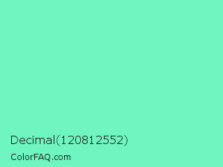 Decimal 120812552 Color is a light green color and the nearest color is Aquamarine #7fffd4. Hex code #6ff5c0 and RGB value is rgb(111,245,192). In RGB color space, this color is composed of 44% red, 96% green, 75% blue, In CMYK color space, this color is composed of 55% cyan, 0% magenta, 22% yellow , 4% black , In HSL color space, this color has a hue angle of 156° , 87% saturation and 70% lightness.