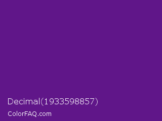 Decimal 1933598857 Color is a normal purple color and the nearest color is Seance #731e8f. Hex code #601689 and RGB value is rgb(96,22,137). In RGB color space, this color is composed of 38% red, 9% green, 54% blue, In CMYK color space, this color is composed of 30% cyan, 84% magenta, 0% yellow , 46% black , In HSL color space, this color has a hue angle of 279° , 72% saturation and 31% lightness.