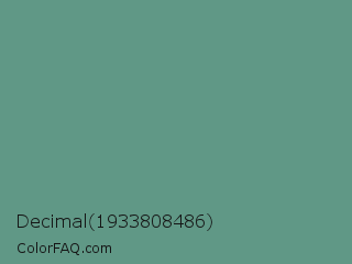 Decimal 1933808486 Color is a normal green color and the nearest color is Patina #639a8f. Hex code #609886 and RGB value is rgb(96,152,134). In RGB color space, this color is composed of 38% red, 60% green, 53% blue, In CMYK color space, this color is composed of 37% cyan, 0% magenta, 12% yellow , 40% black , In HSL color space, this color has a hue angle of 161° , 23% saturation and 49% lightness.