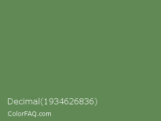 Decimal 1934626836 Color is a normal green color and the nearest color is Glade Green #61845f. Hex code #618956 and RGB value is rgb(97,137,86). In RGB color space, this color is composed of 38% red, 54% green, 34% blue, In CMYK color space, this color is composed of 29% cyan, 0% magenta, 37% yellow , 46% black , In HSL color space, this color has a hue angle of 107° , 23% saturation and 44% lightness.