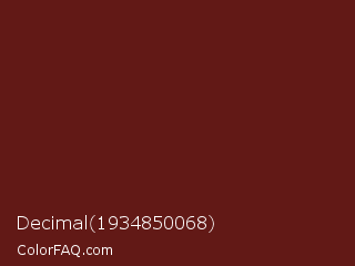 Decimal 1934850068 Color is a dark red color and the nearest color is Cherrywood #651a14. Hex code #621916 and RGB value is rgb(98,25,22). In RGB color space, this color is composed of 38% red, 10% green, 9% blue, In CMYK color space, this color is composed of 0% cyan, 74% magenta, 78% yellow , 62% black , In HSL color space, this color has a hue angle of 2° , 63% saturation and 24% lightness.