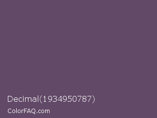 Decimal 1934950787 Color is a normal purple color and the nearest color is Scarpa Flow #585562. Hex code #624967 and RGB value is rgb(98,73,103). In RGB color space, this color is composed of 38% red, 29% green, 40% blue, In CMYK color space, this color is composed of 5% cyan, 29% magenta, 0% yellow , 60% black , In HSL color space, this color has a hue angle of 290° , 17% saturation and 35% lightness.