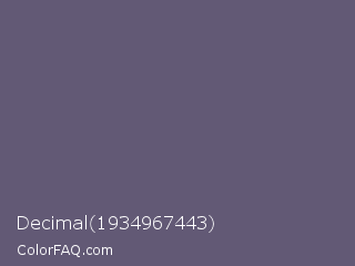 Decimal 1934967443 Color is a normal indigo color and the nearest color is Smoky #605b73. Hex code #625975 and RGB value is rgb(98,89,117). In RGB color space, this color is composed of 38% red, 35% green, 46% blue, In CMYK color space, this color is composed of 16% cyan, 24% magenta, 0% yellow , 54% black , In HSL color space, this color has a hue angle of 259° , 14% saturation and 40% lightness.