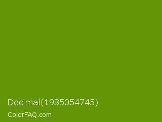 Decimal 1935054745 Color is a normal green color and the nearest color is Limeade #6f9d02. Hex code #629607 and RGB value is rgb(98,150,7). In RGB color space, this color is composed of 38% red, 59% green, 3% blue, In CMYK color space, this color is composed of 35% cyan, 0% magenta, 95% yellow , 41% black , In HSL color space, this color has a hue angle of 82° , 91% saturation and 31% lightness.