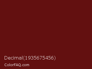 Decimal 1935675456 Color is a dark red color and the nearest color is Dark Tan #661010. Hex code #631010 and RGB value is rgb(99,16,16). In RGB color space, this color is composed of 39% red, 6% green, 6% blue, In CMYK color space, this color is composed of 0% cyan, 84% magenta, 84% yellow , 61% black , In HSL color space, this color has a hue angle of 0° , 72% saturation and 23% lightness.