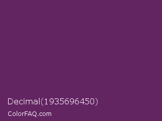 Decimal 1935696450 Color is a dark magenta color and the nearest color is Palatinate Purple #682860. Hex code #632462 and RGB value is rgb(99,36,98). In RGB color space, this color is composed of 39% red, 14% green, 38% blue, In CMYK color space, this color is composed of 0% cyan, 64% magenta, 1% yellow , 61% black , In HSL color space, this color has a hue angle of 301° , 47% saturation and 26% lightness.