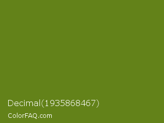 Decimal 1935868467 Color is a dark lime color and the nearest color is Olive Drab #6b8e23. Hex code #638219 and RGB value is rgb(99,130,25). In RGB color space, this color is composed of 39% red, 51% green, 10% blue, In CMYK color space, this color is composed of 24% cyan, 0% magenta, 81% yellow , 49% black , In HSL color space, this color has a hue angle of 78° , 68% saturation and 30% lightness.