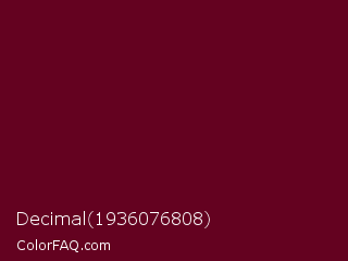 Decimal 1936076808 Color is a very dark rose color and the nearest color is Bordeaux #5c0120. Hex code #640220 and RGB value is rgb(100,2,32). In RGB color space, this color is composed of 39% red, 1% green, 13% blue, In CMYK color space, this color is composed of 0% cyan, 98% magenta, 68% yellow , 61% black , In HSL color space, this color has a hue angle of 342° , 96% saturation and 20% lightness.