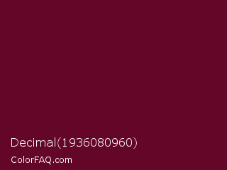 Decimal 1936080960 Color is a very dark rose color and the nearest color is Black Rose #67032d. Hex code #640628 and RGB value is rgb(100,6,40). In RGB color space, this color is composed of 39% red, 2% green, 16% blue, In CMYK color space, this color is composed of 0% cyan, 94% magenta, 60% yellow , 61% black , In HSL color space, this color has a hue angle of 338° , 89% saturation and 21% lightness.