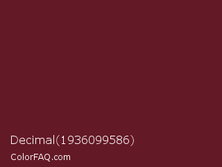 Decimal 1936099586 Color is a dark red color and the nearest color is Persian Plum #701c1c. Hex code #641926 and RGB value is rgb(100,25,38). In RGB color space, this color is composed of 39% red, 10% green, 15% blue, In CMYK color space, this color is composed of 0% cyan, 75% magenta, 62% yellow , 61% black , In HSL color space, this color has a hue angle of 350° , 60% saturation and 25% lightness.
