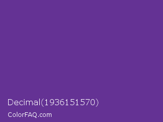 Decimal 1936151570 Color is a normal purple color and the nearest color is Rebecca Purple #663399. Hex code #643294 and RGB value is rgb(100,50,148). In RGB color space, this color is composed of 39% red, 20% green, 58% blue, In CMYK color space, this color is composed of 32% cyan, 66% magenta, 0% yellow , 42% black , In HSL color space, this color has a hue angle of 271° , 49% saturation and 39% lightness.