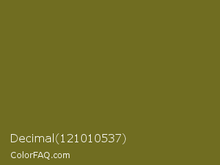 Decimal 121010537 Color is a dark yellow color and the nearest color is Fern Frond #657220. Hex code #706d21 and RGB value is rgb(112,109,33). In RGB color space, this color is composed of 44% red, 43% green, 13% blue, In CMYK color space, this color is composed of 0% cyan, 3% magenta, 71% yellow , 56% black , In HSL color space, this color has a hue angle of 58° , 54% saturation and 28% lightness.