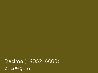 Decimal 1936216083 Color is a dark yellow color and the nearest color is West Coast #625119. Hex code #645815 and RGB value is rgb(100,88,21). In RGB color space, this color is composed of 39% red, 35% green, 8% blue, In CMYK color space, this color is composed of 0% cyan, 12% magenta, 79% yellow , 61% black , In HSL color space, this color has a hue angle of 51° , 65% saturation and 24% lightness.