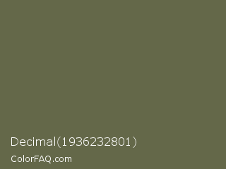 Decimal 1936232801 Color is a normal yellow color and the nearest color is Finch #626649. Hex code #646849 and RGB value is rgb(100,104,73). In RGB color space, this color is composed of 39% red, 41% green, 29% blue, In CMYK color space, this color is composed of 4% cyan, 0% magenta, 30% yellow , 59% black , In HSL color space, this color has a hue angle of 68° , 18% saturation and 35% lightness.