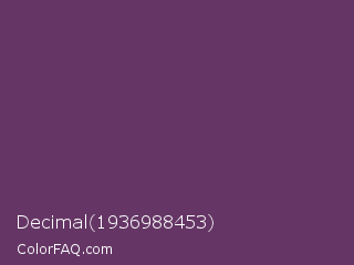 Decimal 1936988453 Color is a dark magenta color and the nearest color is Imperial #602f6b. Hex code #653665 and RGB value is rgb(101,54,101). In RGB color space, this color is composed of 40% red, 21% green, 40% blue, In CMYK color space, this color is composed of 0% cyan, 47% magenta, 0% yellow , 60% black , In HSL color space, this color has a hue angle of 300° , 30% saturation and 30% lightness.