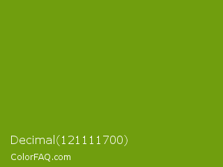 Decimal 121111700 Color is a normal lime color and the nearest color is Limeade #6f9d02. Hex code #709e0e and RGB value is rgb(112,158,14). In RGB color space, this color is composed of 44% red, 62% green, 5% blue, In CMYK color space, this color is composed of 29% cyan, 0% magenta, 91% yellow , 38% black , In HSL color space, this color has a hue angle of 79° , 84% saturation and 34% lightness.