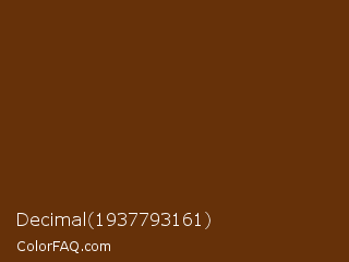 Decimal 1937793161 Color is a very dark orange color and the nearest color is Nutmeg Wood Finish #683600. Hex code #663109 and RGB value is rgb(102,49,9). In RGB color space, this color is composed of 40% red, 19% green, 4% blue, In CMYK color space, this color is composed of 0% cyan, 52% magenta, 91% yellow , 60% black , In HSL color space, this color has a hue angle of 26° , 84% saturation and 22% lightness.