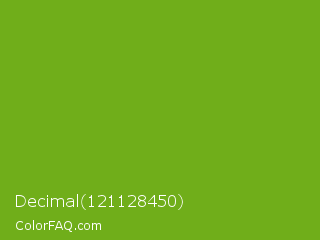 Decimal 121128450 Color is a normal green color and the nearest color is Christi #67a712. Hex code #70ae1a and RGB value is rgb(112,174,26). In RGB color space, this color is composed of 44% red, 68% green, 10% blue, In CMYK color space, this color is composed of 36% cyan, 0% magenta, 85% yellow , 32% black , In HSL color space, this color has a hue angle of 85° , 74% saturation and 39% lightness.