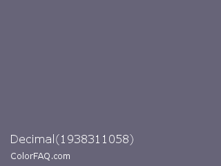 Decimal 1938311058 Color is a normal indigo color and the nearest color is Dolphin #646077. Hex code #676478 and RGB value is rgb(103,100,120). In RGB color space, this color is composed of 40% red, 39% green, 47% blue, In CMYK color space, this color is composed of 14% cyan, 17% magenta, 0% yellow , 53% black , In HSL color space, this color has a hue angle of 249° , 9% saturation and 43% lightness.