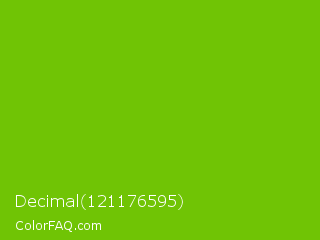 Decimal 121176595 Color is a normal green color and the nearest color is Lima #76bd17. Hex code #70c405 and RGB value is rgb(112,196,5). In RGB color space, this color is composed of 44% red, 77% green, 2% blue, In CMYK color space, this color is composed of 43% cyan, 0% magenta, 97% yellow , 23% black , In HSL color space, this color has a hue angle of 86° , 95% saturation and 39% lightness.