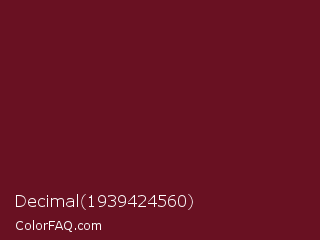 Decimal 1939424560 Color is a dark red color and the nearest color is Persian Plum #701c1c. Hex code #691122 and RGB value is rgb(105,17,34). In RGB color space, this color is composed of 41% red, 7% green, 13% blue, In CMYK color space, this color is composed of 0% cyan, 84% magenta, 68% yellow , 59% black , In HSL color space, this color has a hue angle of 348° , 72% saturation and 24% lightness.