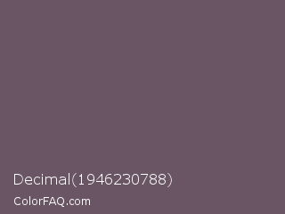 Decimal 1946230788 Color is a normal magenta color and the nearest color is Scorpion #695f62. Hex code #695564 and RGB value is rgb(105,85,100). In RGB color space, this color is composed of 41% red, 33% green, 39% blue, In CMYK color space, this color is composed of 0% cyan, 19% magenta, 5% yellow , 59% black , In HSL color space, this color has a hue angle of 315° , 11% saturation and 37% lightness.