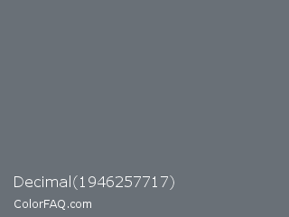 Decimal 1946257717 Color is a normal blue color and the nearest color is Nevada #646e75. Hex code #697077 and RGB value is rgb(105,112,119). In RGB color space, this color is composed of 41% red, 44% green, 47% blue, In CMYK color space, this color is composed of 12% cyan, 6% magenta, 0% yellow , 53% black , In HSL color space, this color has a hue angle of 210° , 6% saturation and 44% lightness.