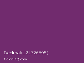 Decimal 121726598 Color is a normal magenta color and the nearest color is Midnight #702670. Hex code #712b6e and RGB value is rgb(113,43,110). In RGB color space, this color is composed of 44% red, 17% green, 43% blue, In CMYK color space, this color is composed of 0% cyan, 62% magenta, 3% yellow , 56% black , In HSL color space, this color has a hue angle of 303° , 45% saturation and 31% lightness.