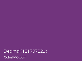 Decimal 121737221 Color is a normal purple color and the nearest color is Maximum Purple #733380. Hex code #71347d and RGB value is rgb(113,52,125). In RGB color space, this color is composed of 44% red, 20% green, 49% blue, In CMYK color space, this color is composed of 10% cyan, 58% magenta, 0% yellow , 51% black , In HSL color space, this color has a hue angle of 290° , 41% saturation and 35% lightness.