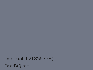 Decimal 121856358 Color is a normal blue color and the nearest color is Storm Gray #717486. Hex code #717786 and RGB value is rgb(113,119,134). In RGB color space, this color is composed of 44% red, 47% green, 53% blue, In CMYK color space, this color is composed of 16% cyan, 11% magenta, 0% yellow , 47% black , In HSL color space, this color has a hue angle of 223° , 9% saturation and 48% lightness.