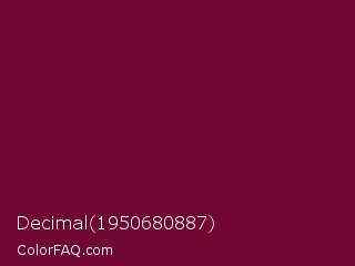 Decimal 1950680887 Color is a dark rose color and the nearest color is Black Rose #67032d. Hex code #700731 and RGB value is rgb(112,7,49). In RGB color space, this color is composed of 44% red, 3% green, 19% blue, In CMYK color space, this color is composed of 0% cyan, 94% magenta, 56% yellow , 56% black , In HSL color space, this color has a hue angle of 336° , 88% saturation and 23% lightness.