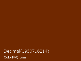 Decimal 1950716214 Color is a very dark orange color and the nearest color is Cedar Wood Finish #711a00. Hex code #702800 and RGB value is rgb(112,40,0). In RGB color space, this color is composed of 44% red, 16% green, 0% blue, In CMYK color space, this color is composed of 0% cyan, 64% magenta, 100% yellow , 56% black , In HSL color space, this color has a hue angle of 21° , 100% saturation and 22% lightness.