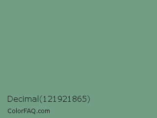 Decimal 121921865 Color is a normal green color and the nearest color is Oxley #779e86. Hex code #719e85 and RGB value is rgb(113,158,133). In RGB color space, this color is composed of 44% red, 62% green, 52% blue, In CMYK color space, this color is composed of 28% cyan, 0% magenta, 16% yellow , 38% black , In HSL color space, this color has a hue angle of 147° , 19% saturation and 53% lightness.
