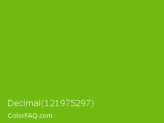 Decimal 121975297 Color is a normal green color and the nearest color is Lima #76bd17. Hex code #71ba11 and RGB value is rgb(113,186,17). In RGB color space, this color is composed of 44% red, 73% green, 7% blue, In CMYK color space, this color is composed of 39% cyan, 0% magenta, 91% yellow , 27% black , In HSL color space, this color has a hue angle of 86° , 83% saturation and 40% lightness.