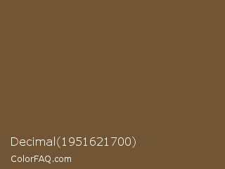 Decimal 1951621700 Color is a normal orange color and the nearest color is Tuscan Brown Coffee #6f4e37. Hex code #715534 and RGB value is rgb(113,85,52). In RGB color space, this color is composed of 44% red, 33% green, 20% blue, In CMYK color space, this color is composed of 0% cyan, 25% magenta, 54% yellow , 56% black , In HSL color space, this color has a hue angle of 32° , 37% saturation and 32% lightness.